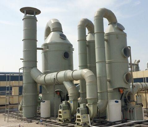 溫州客戶(hù)噴淋塔安裝現(xiàn)場(chǎng),酸霧廢氣由風(fēng)管引入凈化塔,經(jīng)過(guò)填料層,廢氣與氫氧化鈉吸收...